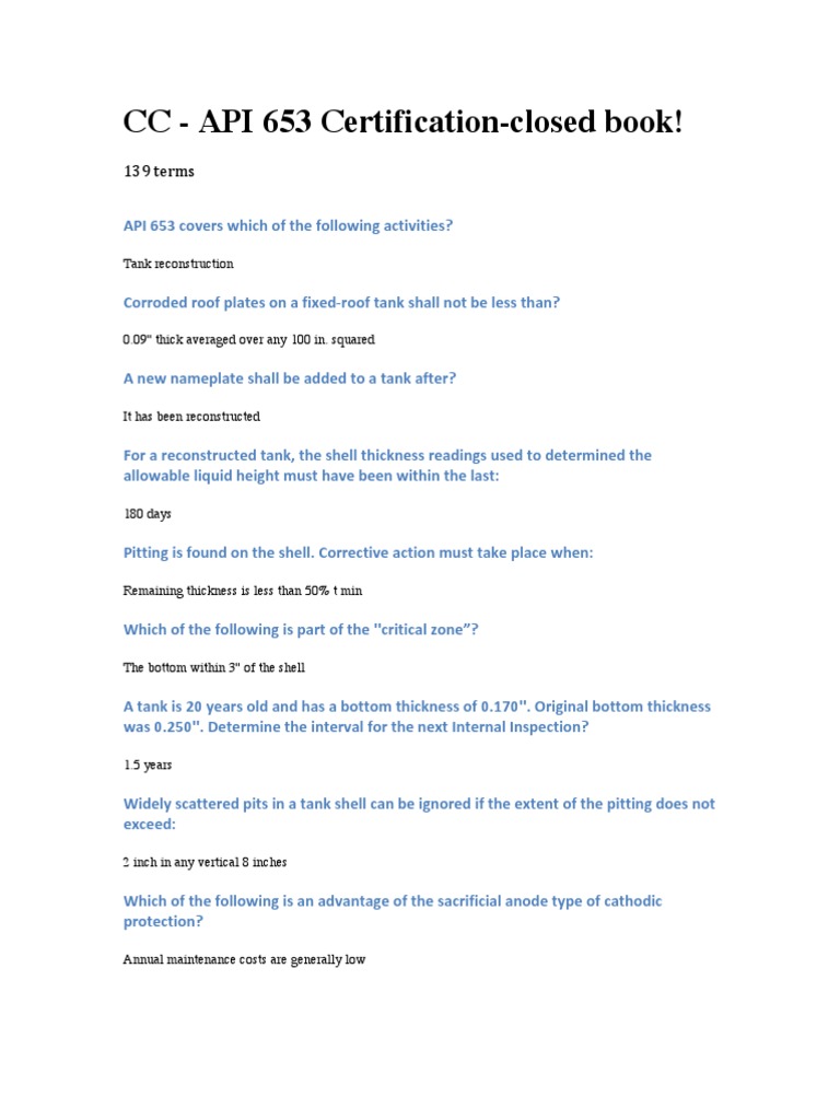 API-653 Real Exam API-653 PDF Material 2018 .pdf - API API ... from www.coursehero.com Type your wanted pdf description or name. Ndt inspection api 653 inspection dam inspection inspection nde inspection furniture inspection inspection and testing inspection checklist inspection checklist car drone inspection visual inspection thermographic inspection cmid. Therefore, the tank will need to comply with all of the requirements of api 650. Standard 653 minimum requirements for maintaining the integrity of such tanks after they have been placed in service and addresses. It opens on all devices conveniently. As of today we have 80,347,763 ebooks for you to download for free. Api 650 amp 653 questions closed book with answers slideshare. Api std 653 is a standard that covers steel storage tanks built to api 650 and its predecessor api 12c.
